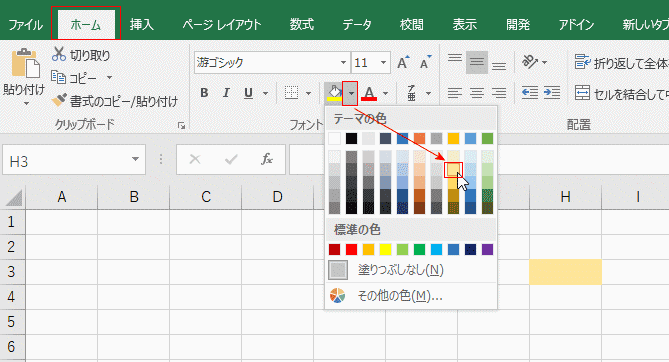 - セルを塗りつぶすにはフォントグループの[塗りつぶしの色]がよく利用されます。