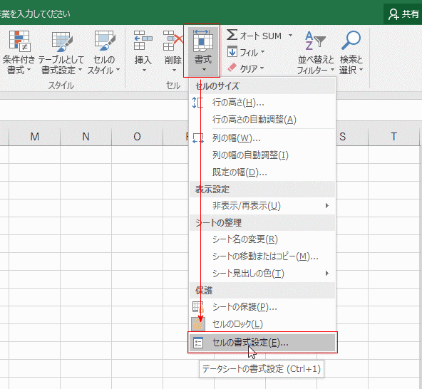 [ホーム]タブの[書式]→[セルの書式設定]を選択します。