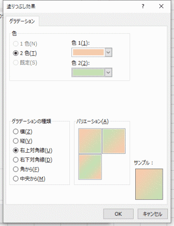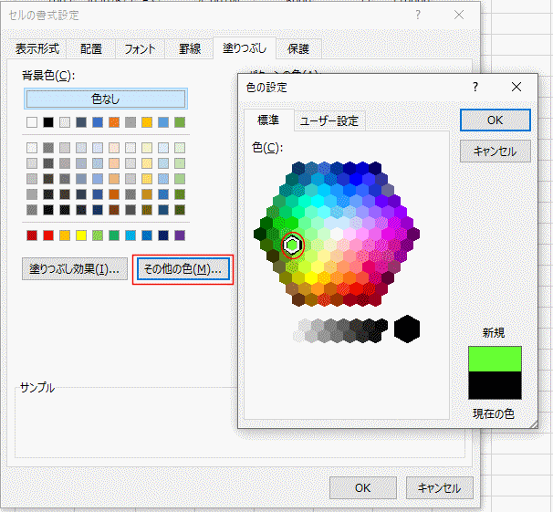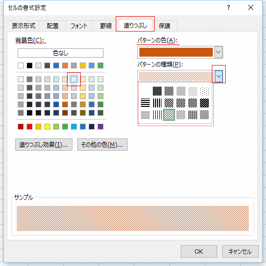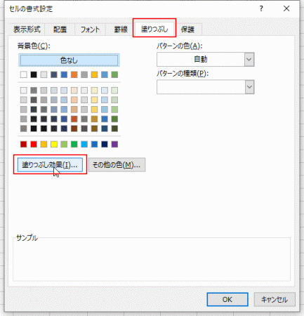 - セルの書式設定ダイアログで[塗りつぶし]タブを選択します。