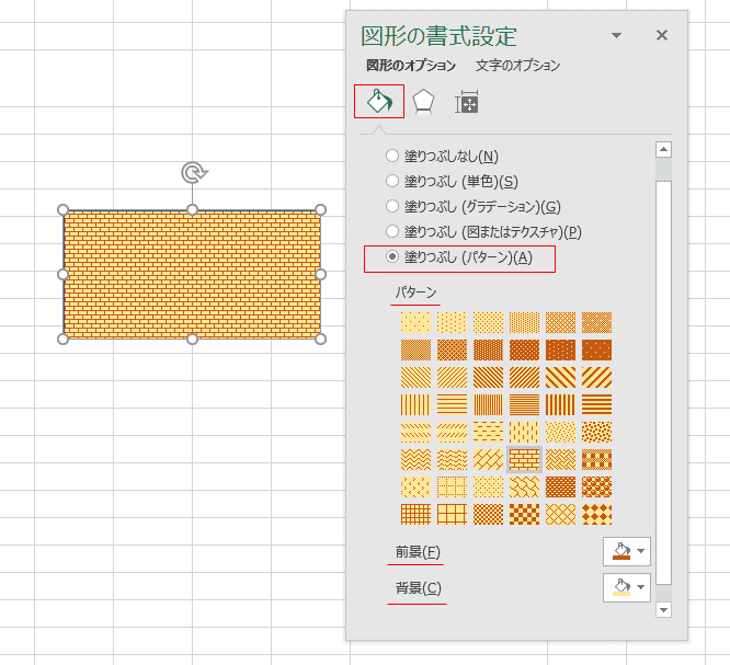 - 図形でもパターンを設定することができます。(Excel2007ではできませんでしたが、Excel2010以降で復活しました)