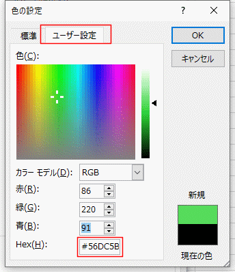 その時の16進数もカラー値が表示されます。または、16進数のカラー値を指定することもできます。